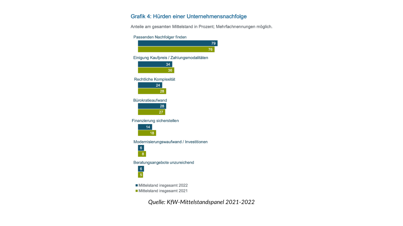 Laut KfW-Nachfolge-Monitoring Mittelstand steht die Babyboomer-Generation vor der Herausforderung der Unternehmensübergabe, während die nachfolgende Generation oft weniger Interesse an der Übernahme bestehender Unternehmen haben. Zudem entstehe eine Nachfolgelücke durch eine geburtenschwache Generation, wodurch es generell an Nachwuchs fehle.